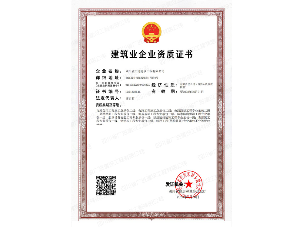 目前,公司建筑工程施工總承包資質(zhì)已升級為壹級資質(zhì),公司有職工280余人,有職稱人員113人(其中高級職稱3人、中級職稱32人、初級職稱78人);各類管理上崗人員40余人;大中專學歷85余人;高中專學歷120余人。企業(yè)法人代表兼總經(jīng)理:謝云君,注冊資金壹億伍仟萬元,下面設有一個分公司“四川省廣進建設工程有限公司赤水分公司”,分公司地址:貴州省遵義市赤水市太平街。
